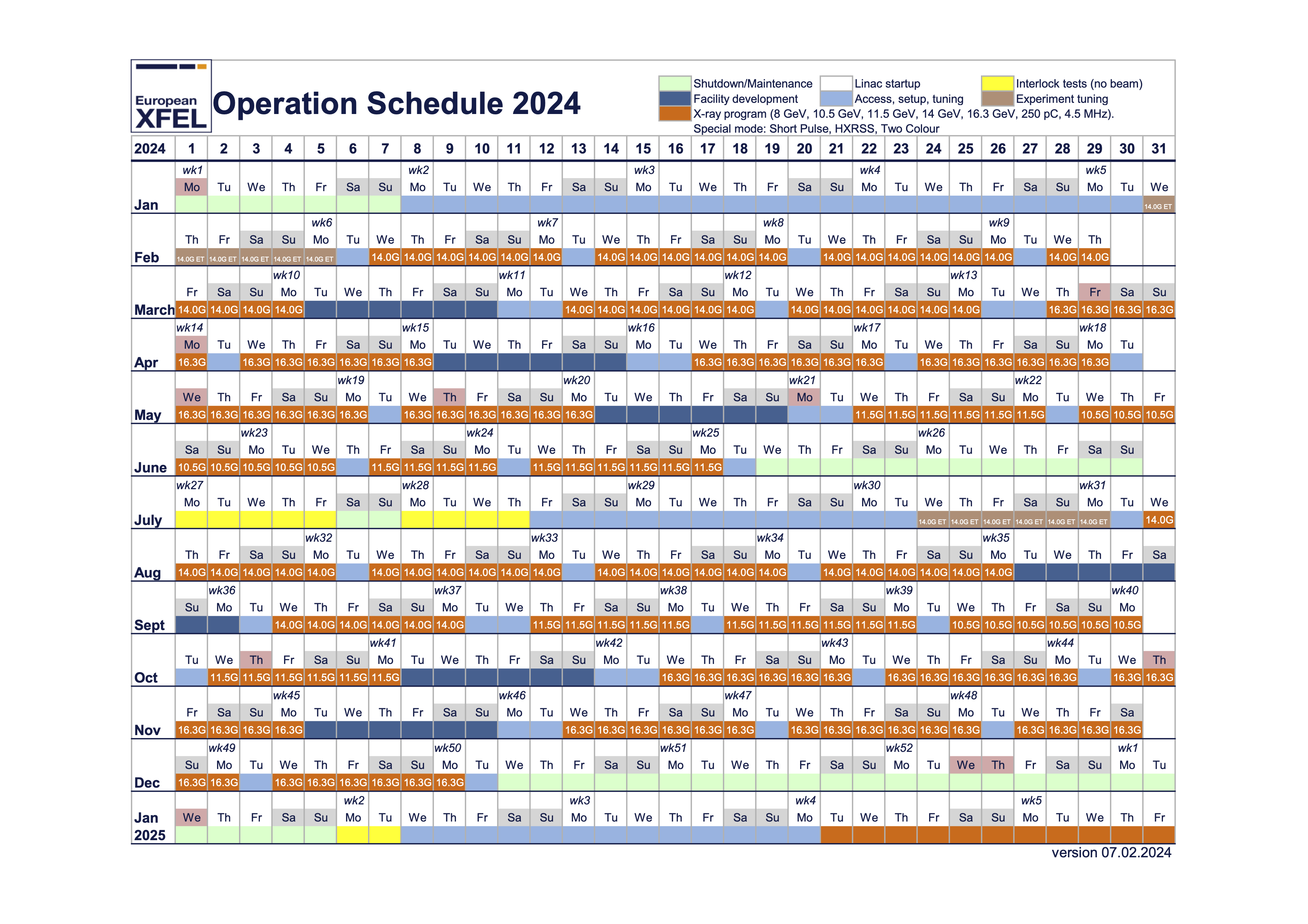 The operation schedule shows planned beam time for the coming months and the facility status diagram shows current X-ray delivery.