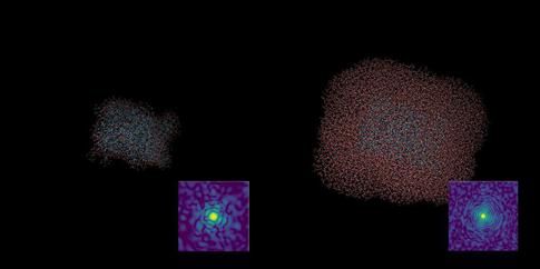 One example of the technologies developed through EUCALL: SIMEX, a simulation platform that allows scientists to virtually run X-ray imaging experiments. In this example, a protein (left) is virtually imaged using an X-ray laser, resulting in the diffraction pattern next to the molecule. However, if the protein is surrounded by a 20-Angstrom-thick layer of water molecules--a state commonly seen with such biomolecules--then the simulation shows how the diffraction pattern is distorted by the water's presence. These details can help scientists better prepare for their experiments and understand possible results before spending valuable time at a scientific instrument figuring out subtleties in the experiment. (Image: European XFEL)